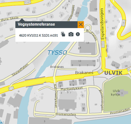 Sjekk kven som har ansvar for vegen på Statens Vegvesen sine nettsider. Trykk på det aktuelle vegstrekket og få info om vegen/vegreferansen: